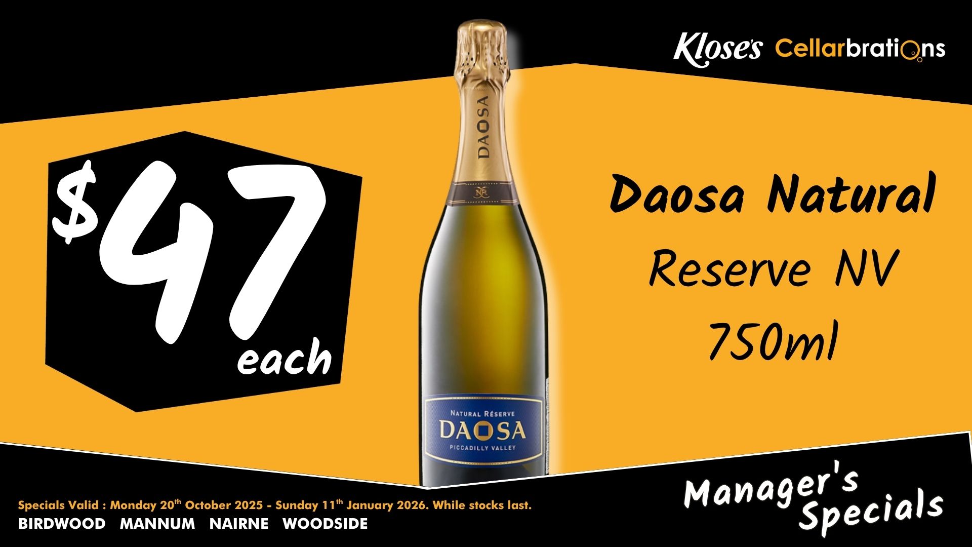 DAOSA NATURAL RESERVE NV 750ML DAOSA NATURAL RESERVE NV 750ML October 20, 2025 Kylie Heritage October 20, 2025 Categories:Cellarbrations Specials 0 Likes