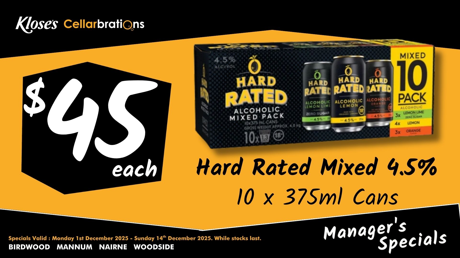 HARD RATED MIXED 4.5% 10 X 375ML CANS HARD RATED MIXED 4.5% 10 X 375ML CANS December 1, 2025 Kylie Heritage December 1, 2025 Categories:Cellarbrations Specials 0 Likes
